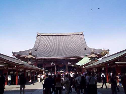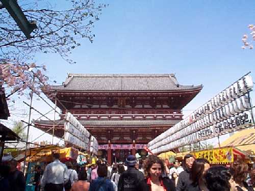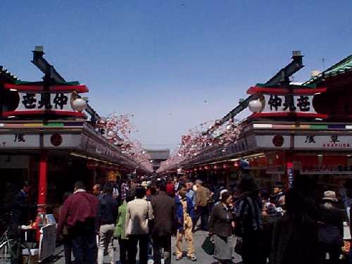 | 雷門を潜り抜けると、仲見世通りが真っ直ぐに伸びている。 両側は,みやげ物やら、遊技場になっており,毎日が縁日で有る。 |