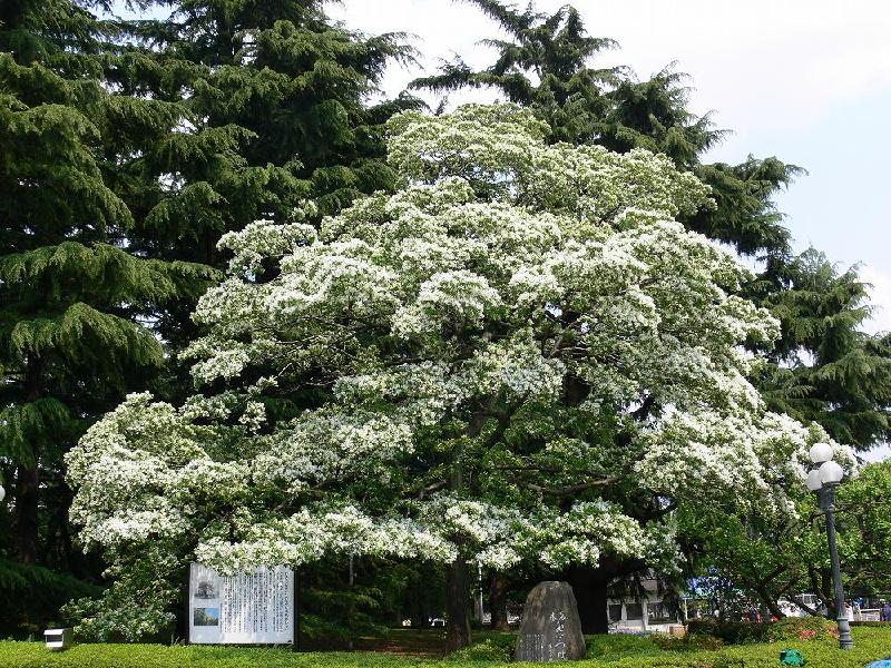 初代ヒトツバタゴは青山連兵場の時代から「なんじゃもんじゃ」の俗称で呼ばれ、名木、珍木として珍重されてきたが、 初代の木が枯死したため、現在のヒトツバタゴが植えられたといわれています。 花は5月上旬に白い花を咲かせていますが、6月に再撮影に行った時は実が付いていました。