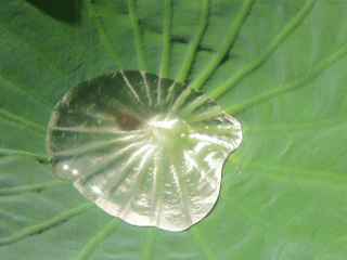 この茎の中の空気穴が太陽熱で温められると、飽和した空気が葉っぱの表面の空気穴に 漏れてきて、中央に溜まった水から、あぶくが出てきます。