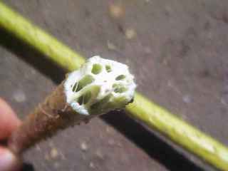 ハスの栽培は、古代から布を織る為に、乾燥したハスの茎から、繊維を取り出しています。 ハスの芋とハスの葉やハスの花とを繋ぐために、ハスの茎が存在するのですが、空気穴の 目的、働きは私には解りません。