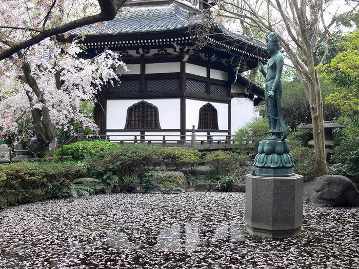 散った桜の花びらが池に浮かび、「夢違観音」とのコラボレーションは風情が有りました。