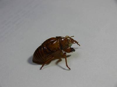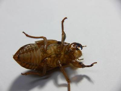 抜け殻を調べて見ると、地中にいたときから、右の前足はダメージを受け、変形していたのである。 |