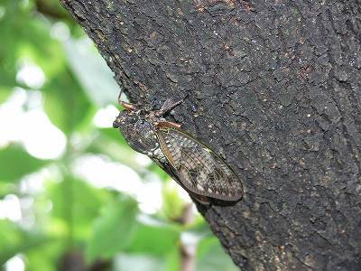 7月30日朝7:40、ゴミ出しの為、庭に出るとコンクリートの踏み段の上に、7年間地中で生活していた油蝉がうずくまっていた。 おそらく、近くの杏の木から滑り落ちたのであろう。 本来なら、夜中の内に脱皮しているはずなのに、木から落ちた瞬間に、失神でもしてしまったらしい。 とりあえず、7:41に杏の木の幹に載せてあげる。 |