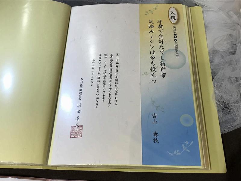 館山市の短歌学習会に参加し、「青垣 暁風景」で腕を磨き、館山市短歌大会で頭角を表し、NHK短歌全国大会に入選したのを皮切りに、NHK学園生涯学習フェスティバル 伊香保短歌大会、武蔵野市短歌大会、誌上短歌大会、くにたち短歌大会などで入選を勝ち取って行ったのであります。