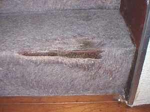 唯一、鉄製の階段に貼り付けているジュータンが爪研ぎ場所になり、「チャブ」の長年の作業で、ジュータンはところどころ毛羽立ち、穴があき地肌の鉄板がむきだしになった。 |