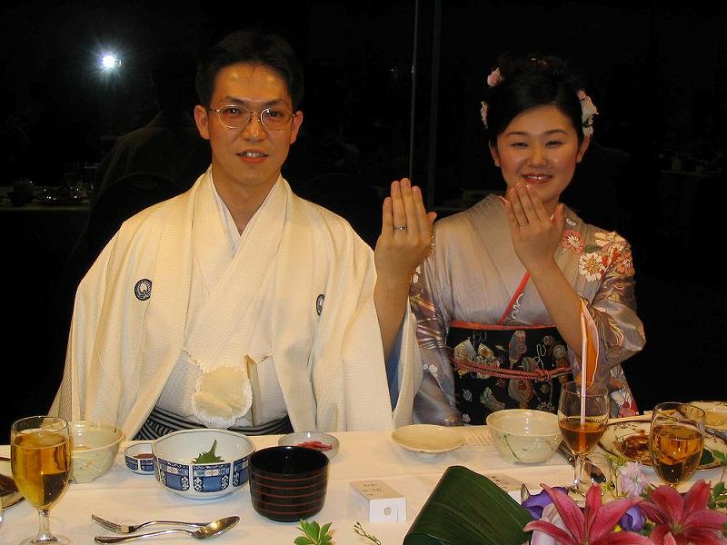 式場は明治神宮(控え室は客殿に集まり、時間になると、神宮の左側の廊下を歩く、この時、参拝者の視線に触れられる、そして内拝殿を通り、参拝者の視線は、届かなくなり、本殿にて、玉串を上げ、三々九度の式典へ、指輪交換が行われた。)、一旦客殿に戻り、続いてバスに乗り込み、明治神宮会館へ行った。明治神宮会館では、披露宴があった。 披露宴は二人の嗜好が入ったものだった。 餅つきは初めてみた。