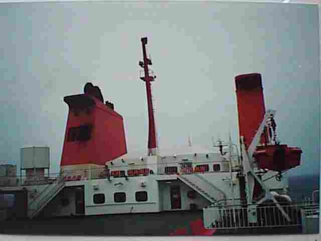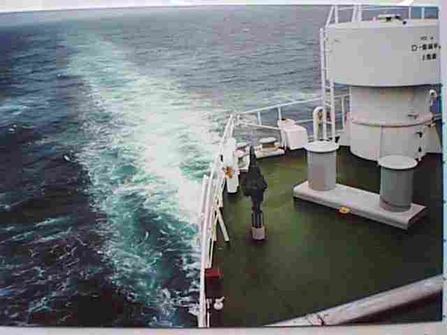 午前中日差しも強くなってきたので、甲板に出て、心地よいエンジン音の振動と、潮風をうけながら、日光浴としゃれ込んだ。 あまりの暑さに雨傘で日除けを作ったが、足の方はズボンをまくり上げただけだった。