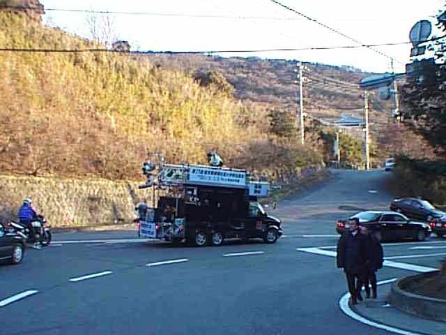 明日は、箱根駅伝のため、テレビの中継車がリハーサルしていた。