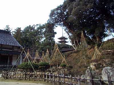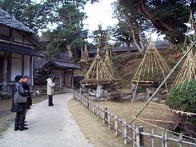 | 上時国家の母屋の正面玄関 | 上時国家の軒下の雪囲い・・・積雪は厳しい |