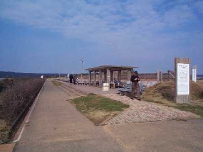 | 世界一長いベンチ・・女将手製のオニギリあり | ベンチ前の増穂浦の海岸線 |