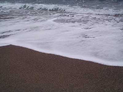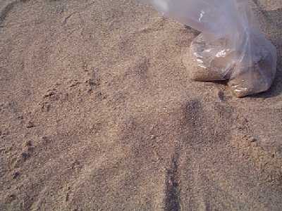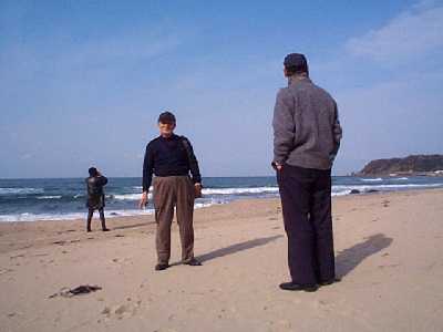| 泣き砂の音を確認している | 沖縄はサンゴ。ここは、細かく結晶した石砂。 拡大写真は、ここをクリックする。http://page.freett.com/konchan2002/2002-1tabi/noto/sunakakudai.htm |