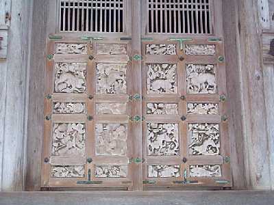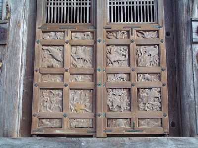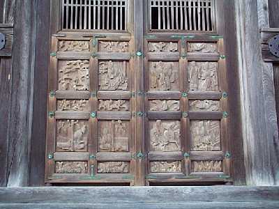 | 北陸唯一の木造五重塔、総高34.18m国宝 | 五重塔の正面扉の彫刻 |