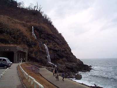 | 巌門洞窟を潜りぬけて、ここに出た | 巌門展望台の側にあった名無しの滝 |