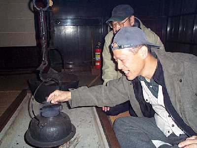 | 囲炉裏端でくつろぐ | 近ちゃん・・蓋を持って、あっちちちいー |