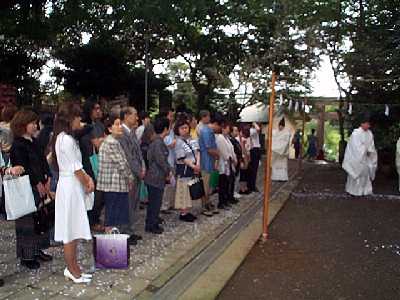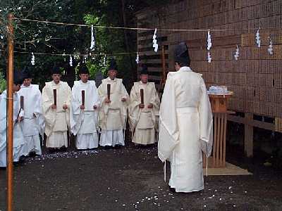 | 神主が祈祷を行なう | 神事を見守る参加者たち |