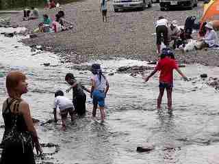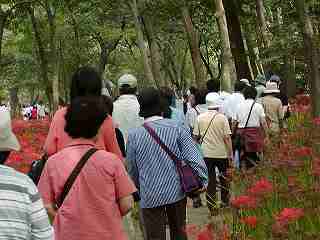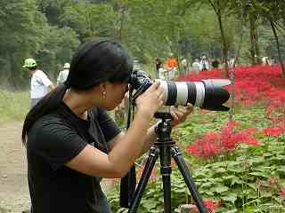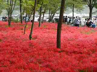 高麗の巾着田とギャラリーたち 2004年9月20日、日本一の曼珠沙華を取材しました。 日高市内を流れる清流、高麗川(こまがわ)の蛇行により長い年月をかけてつくられ、 その形がきんちゃくの形に似ていることから巾着田(きんちゃくだ)と呼ばれるようになりました。