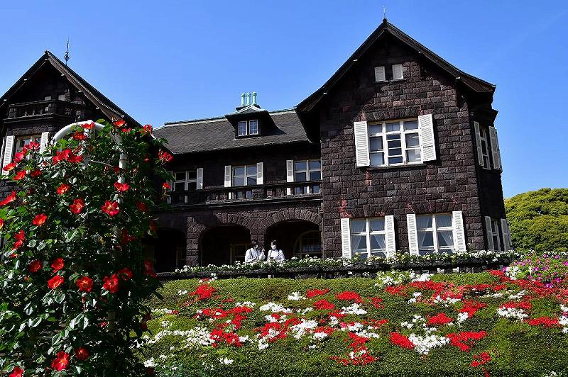 そして、一番下には日本庭園があり、晩秋の紅葉も茶室を中心に撮影したけど良かった。さて、下の写真だが、一枚目は、 石造り洋館とつつじと春バラのコラボである。