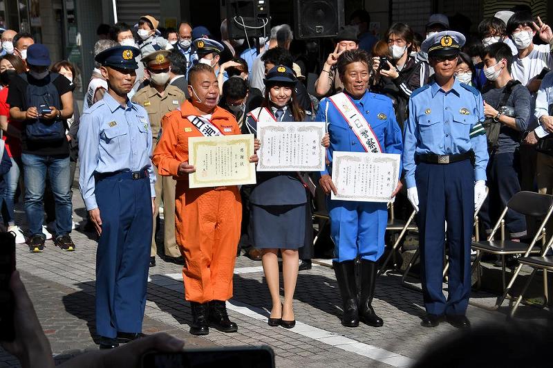 一日警察署長には、女優・タレントの「丸りおな」と、オートバイレーサーで国際A級レーシングドライバーの「加賀山就臣」、一日消防署長にお笑いタレントの「出川哲朗」が就任し、イベントに華を添えた。