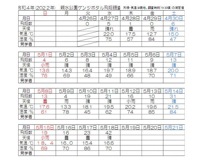 まず、「親水湿生公園」の5月18日の飛翔数は42頭(但し2022年は、4年ぶりに2月13日に養殖したゲンジホタルの幼虫400匹を放流しているので、2021年のデータはあてにならない。)である。