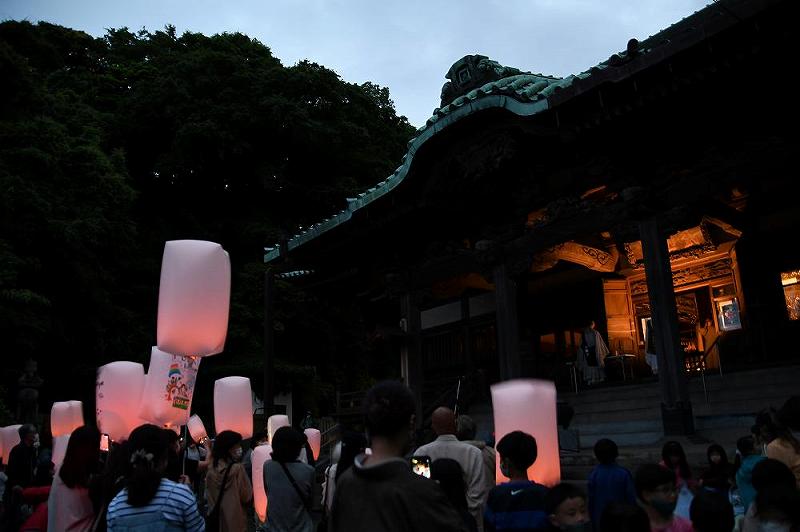 これはいかんと思い、境内脇から階段を使い、本堂の脇の広場に出た。 18:45から住職の読経が始まり、続いて本堂前では歌手と子供たちの歌声が聞こえてきた。