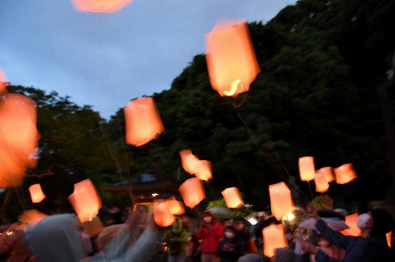 19:03歌声が終了したら、らんたんは空高く上げられた。 雨が降る中、カメラを上空に向けると、水滴が付くので、あまり上空には向けられない。