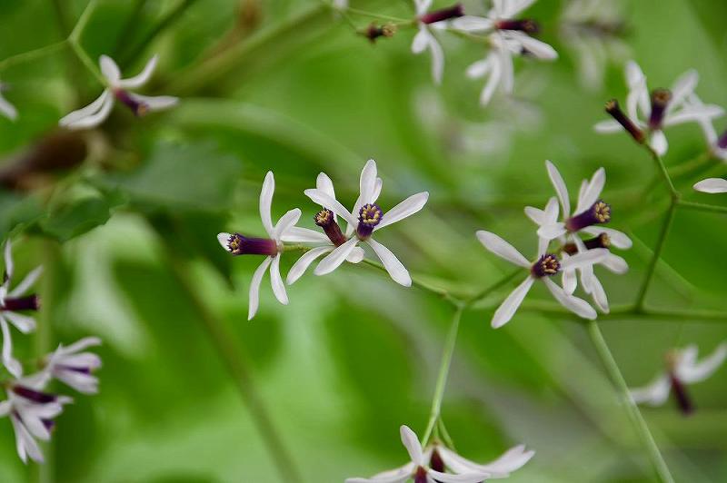 花は独特の形をしている。 センダンの開花時期は5〜6月です。 その年の枝の葉のつけ根から花茎を出し、直径2cmほどの花が円錐状にまとまって開花します。 薄紫色の花が樹木全体を覆うように開花する様子は、紫のもやがかかったようで見ごたえがあります。