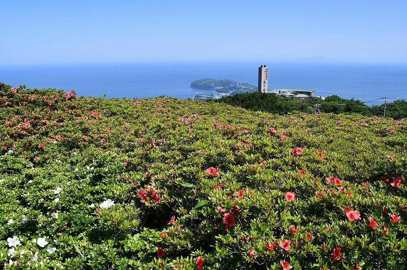 星ケ山公園「さつきの郷」は、標高約450メートルの位置にあるためとても眺望が良く、紺碧の相模灘とピンクのさつきを一緒にお楽しみいただける観光スポットです。