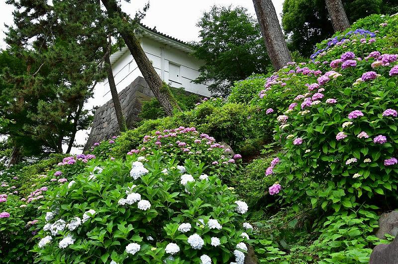 なかでも、10000株の花菖蒲と同時期に見頃となる東堀には、大勢の人が訪れて常盤木門の建物と石垣と色とりどりのアジサイを写真に撮っていました。
