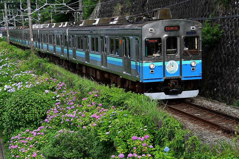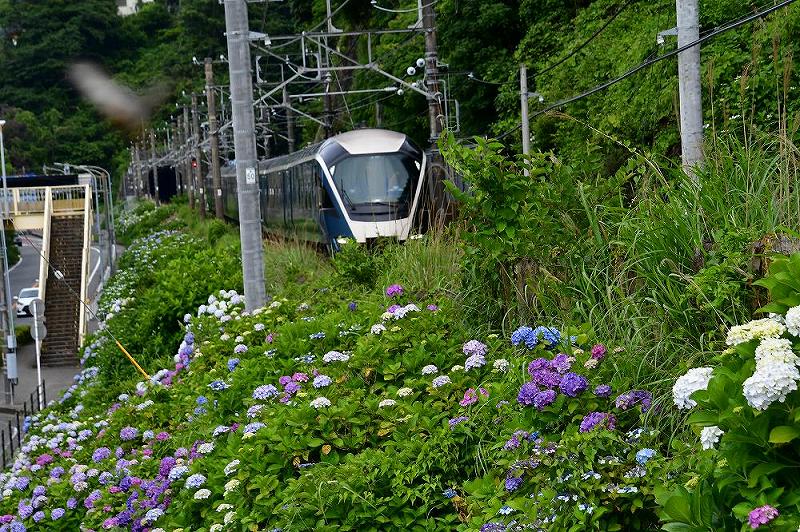 そして、また、400メートルの「アジサイ街道」を歩くことに、その間に電車が通ったが、かろうじて写真に撮る。