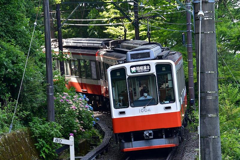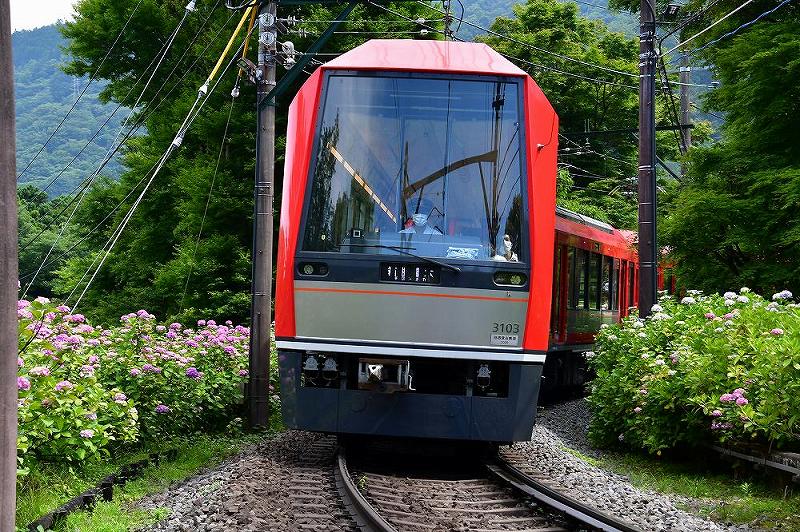 実は、2018年から2021年までは、大平台トンネル前のあじさいの全滅を最後に(2016年のこと、土に病原菌があったらしく、あじさいが全滅したので、株ごと処分したそうだ。)、その後、コロナ禍のため取材していなかった。 5年ぶりの「あじさい電車」新型車が多くなり、運転席の後ろからも展望は良く、撮影も可能となった。