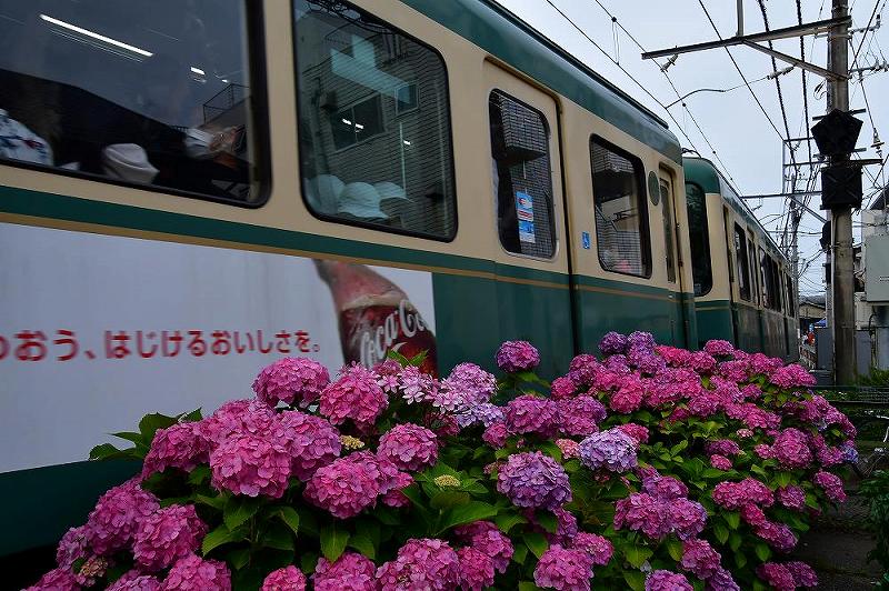 「腰越」から「極楽寺」まで電車に乗り、途中で見つけた踏み切りそばのあじさい、ここも穴場のポイントだった。