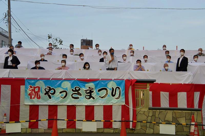 ただ、「やっさ踊り」のパレードは参加人数を減らし、花車は通常通り、もっとも担ぎ手で密になる神輿は中止。今回は2回目の取材なので、メイン会場で「湯河原町長のやっさまつり宣言」を撮影した。 要人警護のために町長の側には2人、見物人の前に2人の見張りがいて、神奈川県警の制服組みも数人いた。