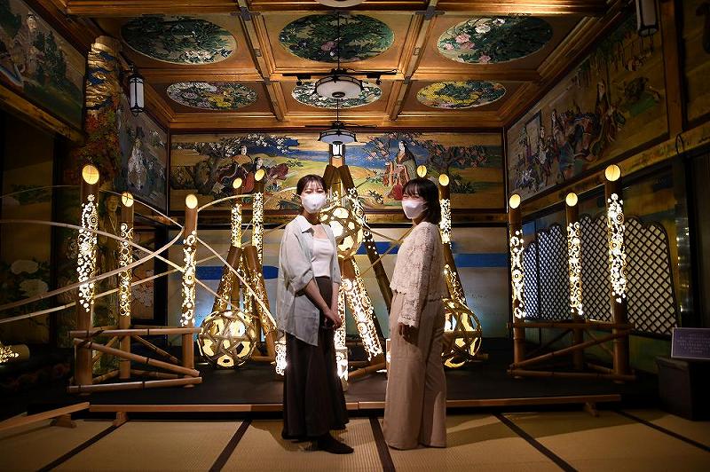 続いては、「漁樵(ぎょしょう)の間」。 床の間は菊池華秋の美人画、欄間は尾竹竹坡の五節句が浮彫された極彩色の部屋に、静岡市のアカリノワ「環・和・輪」が、放置竹林の竹を利用した「竹のあかり」を制作している。 竹から発する無数の光が、極彩色の室内を怪しくあでやかに照らします。