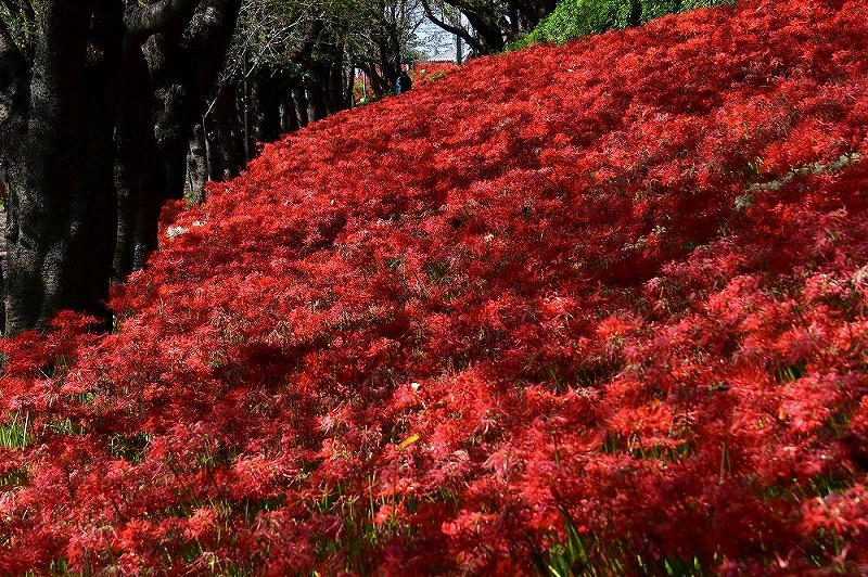 権現堂堤には「三脚も一脚も使用禁止」の通知は出ていない。 ここの「曼珠沙華」は、約550メートルの堤に植樹されており、東斜面と西斜面の法面を使用しており、写真は法面を活用し、遠くまでおさめることが出来るので、画面全体が真っ赤に燃えているように、撮影出来た。