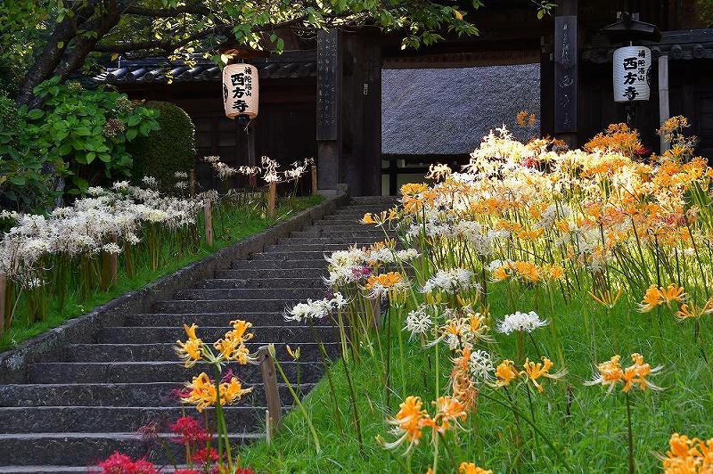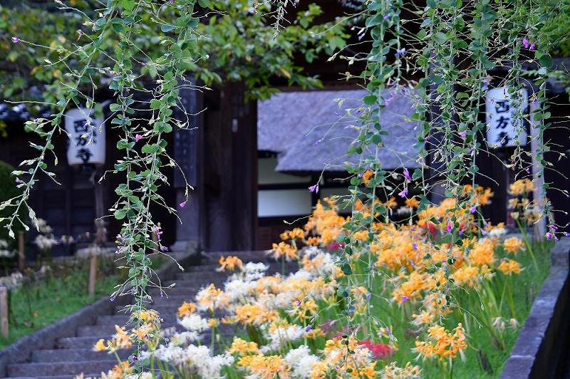 ところが、11年前とは違い、石階段の両側の白いヒガンバナの花や黄色いヒガンバナの花は、一斉に咲き密集していた。