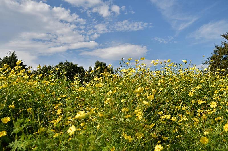 国営昭和記念公園の花の丘のレモンイエローのコスモス「キバナコスモス」「レモンブライト」が現在、見頃を迎えている。