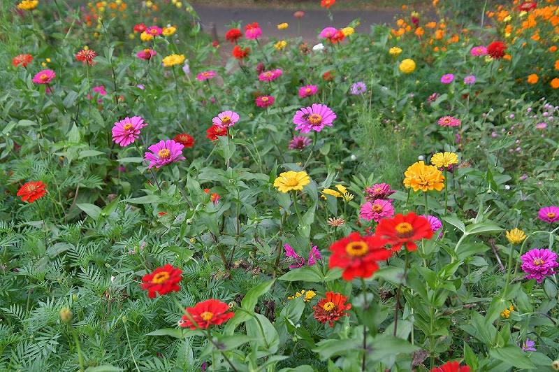 原っぱ東花畑では、コスモスをはじめ、ジニア、ペチュニア、センニチコウ、ケイトウのほかに、可愛らしいマツバボタンやマリーゴールドなど20品種の秋の草花が勢ぞろいした「秋のブーケガーデン」には20万本の秋の花々が、それぞれ見頃を迎えていました。
