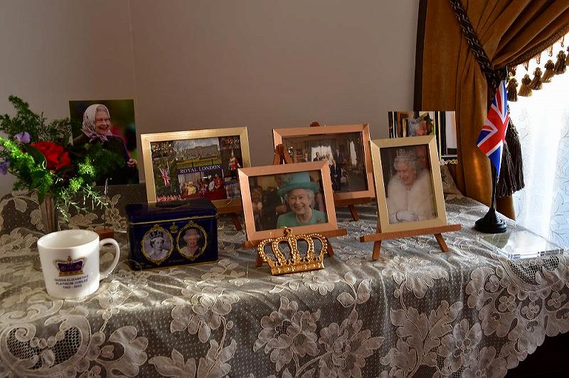 寝室では、「ホームズ物語」から4つのシーンを選んで再現しています。イギリスと言えば、記憶に新しい「エリザベス女王」、最近の写真が机の上に6枚飾ってありました。 |