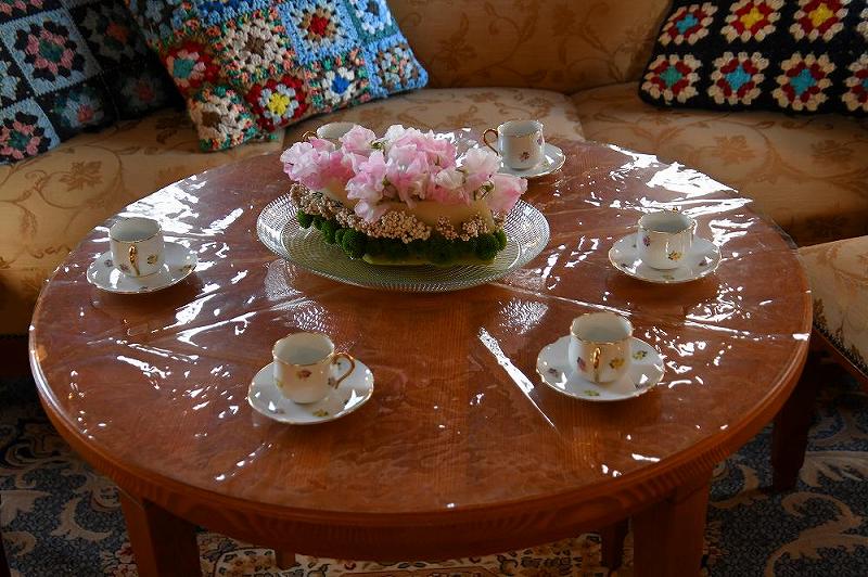 客間のお雛さまは、お花の雪洞やたくさんの花に囲まれてひっそり佇んでいます。