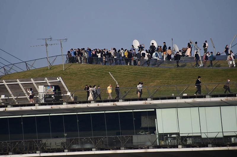 一方、大桟橋の人達は、この巨大なビルのような物が、横浜港に掛かるベイブリッジを潜れるのか心配しながら、見送っていました。 |