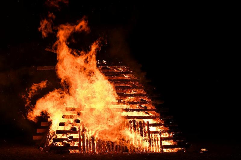 3メートルほどの櫓が組まれ、中には箸がたくさん入っていた。 お炊き上げが充分に燃え盛ると、伊東太鼓の演奏が始まり、その後には、お神輿も会場にやってきて、手締めが行われる。