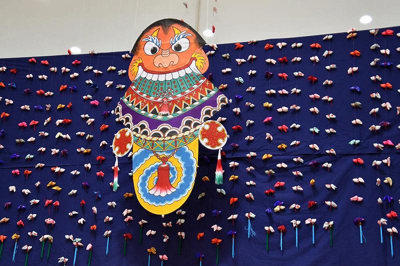 会場内を2階から見下ろす場所に、横断幕が架かっており、その中央に「ばらもん凧」があり、全体の上部が鬼、中段部が武者兜の後ろ姿、下段部が嵐の中の渦をデザインされており、嵐の中鬼が真正面から兜をくわえたままでも前へ進み続ける、敵に後姿を見せぬ勇猛な武者を表現している。