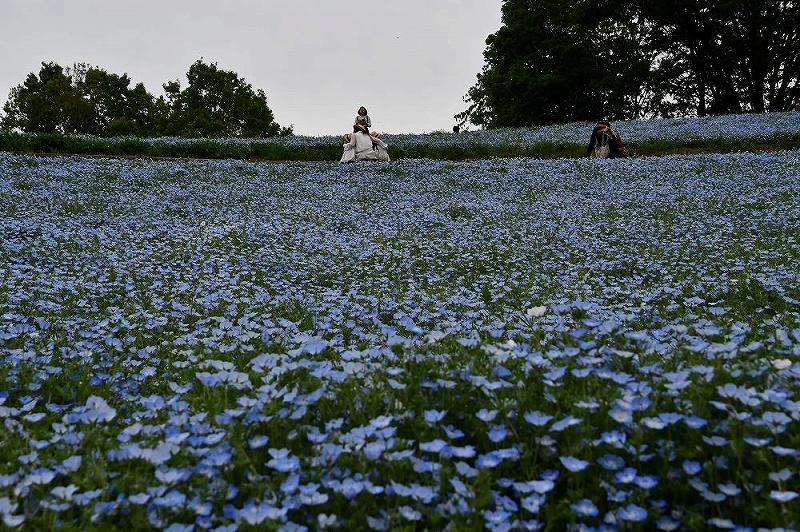 花の丘(長さ200メートル、幅60メートル)で約180万本のネモフィラが見ごろであった。ところどころに置かれたフォトスポットが、大人気を博していた。 青い海に浮かぶ「白いボート」、丘の上に設けられた「白いブランコ」、そして、「白いドア」。