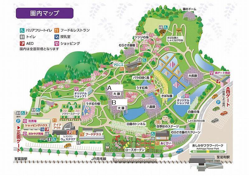 下の写真の画面中央にある「A」と「B」の大藤は枝も伸び、いまでは繋がっており、2,000平方メートルの広さになっています。