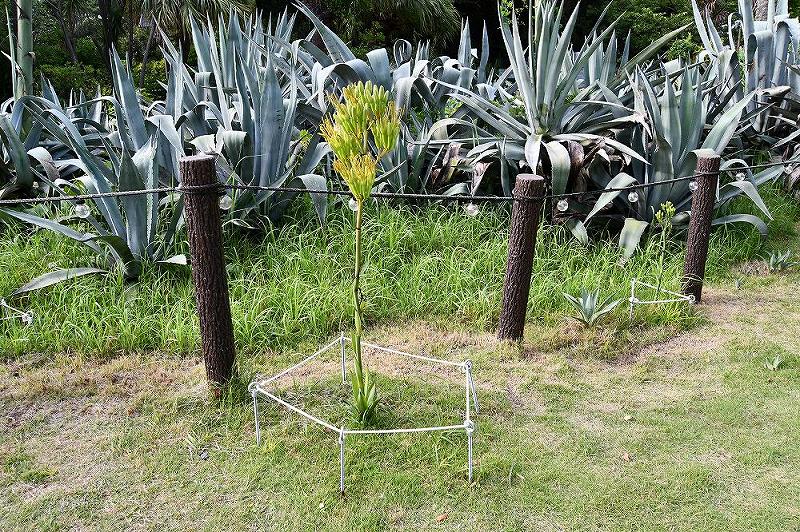 7/19には、7〜8メートルの花が2本(2週間ほどは見ごろが続く)・・・60年余りの古い株と、0歳(地中から直接の花)から3歳ほどの株にも花が咲いていた。 江ノ島のように、「赤ちゃんのアオノリュウゼツラン」の様な情報はどこにもないので、『60年ぶりに花が咲いた』だが、根拠が揺らぐこの写真結果を専門家はどう説明するのか興味がわいた。 |