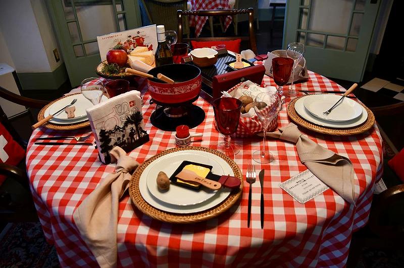 スイス国旗の色、赤と白をテーマに家族団らんのクリスマスディナーテーブルをコーディネート。 スイスの木工製品や、クリスマスオーナメントなども飾ります。 サロンでは、スイスを代表する食材「チーズ」のある食卓を再現。 スイスのチーズの紹介もしています。 |