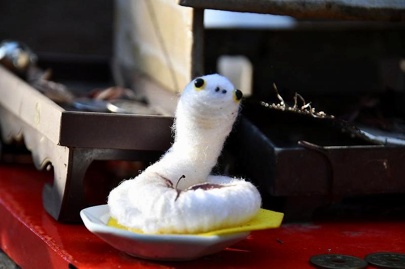 そして、主役の高さ6センチほどの小さな白蛇(繭製)が2匹、左右に座っていました。 |