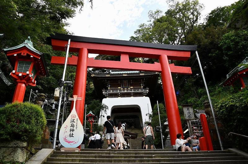 | 江の島にも「とぐろを巻いた白蛇」がいました。 場所は「朱の鳥居」、「瑞心門」をとおり「辺津宮」の境内に、『奉安殿』があり、日本三大弁財天として有名な八臂弁財天(はっぴべんざいてん)と裸弁財天・妙音弁財天の二対が祀られています。 撮影禁止でしたので、撮影していませんが、なかなかの美人さんでした。 弁財天といえば、「白蛇」がつきもの、お守り様にちいさなとぐろを巻いたヘビが沢山並んでいました。