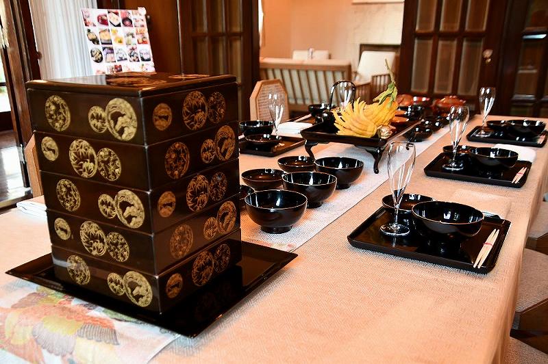 エリスマン邸の、テーマは、『輪島塗師屋(ぬしや)・大崎家のお正月』 装飾は、大崎漆器店サポートGRP 監修は、大崎悦子食堂のテーブルでは、輪島の塗師屋を営んでいる大崎家のお正月を再現していました。 お雑煮は古代朱の蓬菜真希絵椀を使い、昆布だしに丸餅、岩海苔、鰹節をのせている。 5段の重ね重には立派な蒔絵が施され、干支の蒔絵椀にはリアルな動物が描かれていました。
