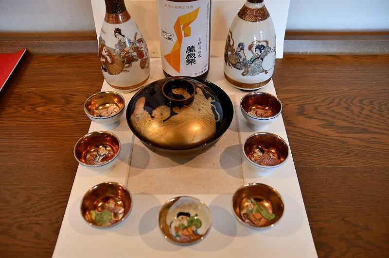 居間のテーブルやピアノの上や、棚にもお菓子や漆器のほかに、石川県の九谷焼の酒器と石川県の小掘酒造店の「萬歳楽」と七福神の描かれたぐい飲みが並んでいました。 |